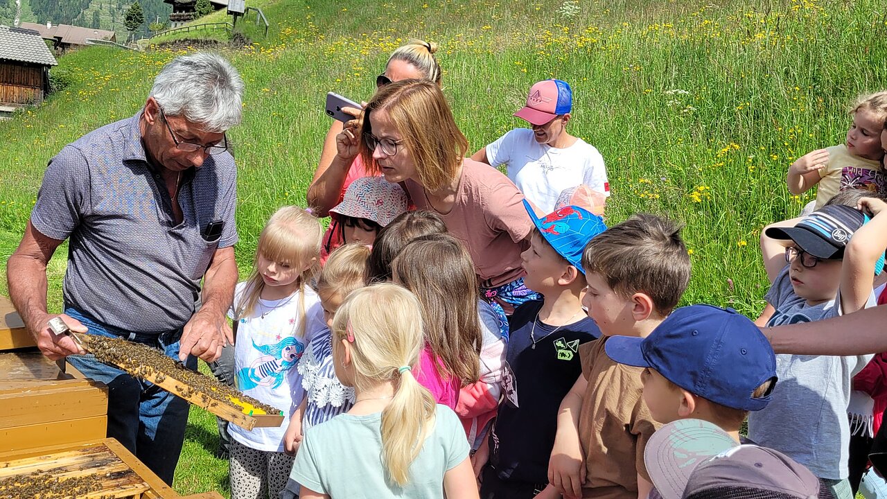 Neben der kleinen Berglandwirtschaft und der Vermietung betreuen wir noch eine Imkerei mit eigener Königinnenzucht. Mit den beiden Töchtern, Manuela und Theresa bewirtschaften wir ca. 150 Bienenvölker. Diese produzieren einen überaus leckeren und hochwertigen Honig aus dem Nektar von hauptsächlich Löwenzahn, Heidelbeere, Wald, Himbeere, Alpenrose und den vielfältig blühenden Bergwiesen. Somit ist unser Honig eine Mischung aus verschiedenen Blüten und Kräutern.